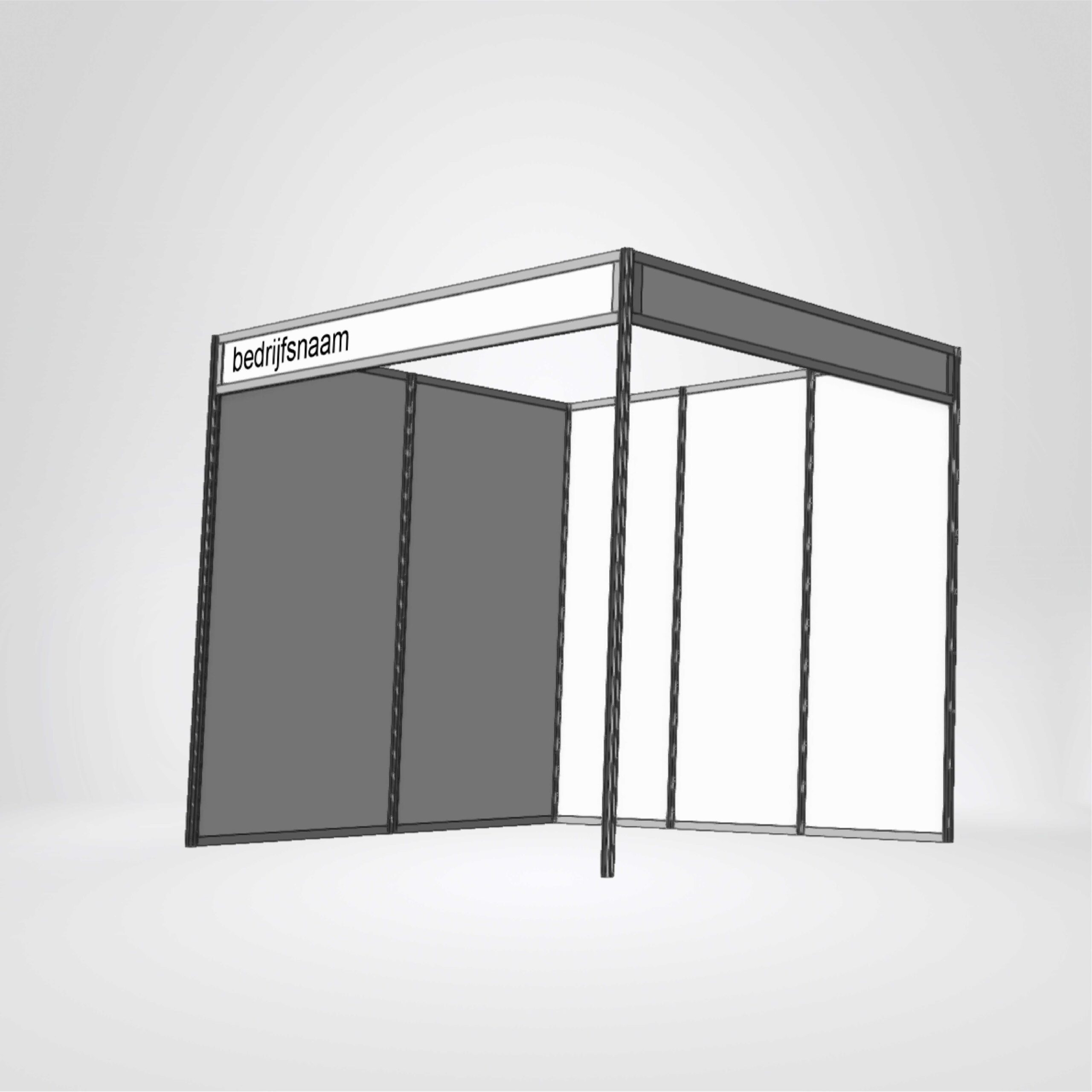 Bijgevoegd ziet u de impressie van uw stand. De standaard witte wand kunt u vervangen door een peesdoek.